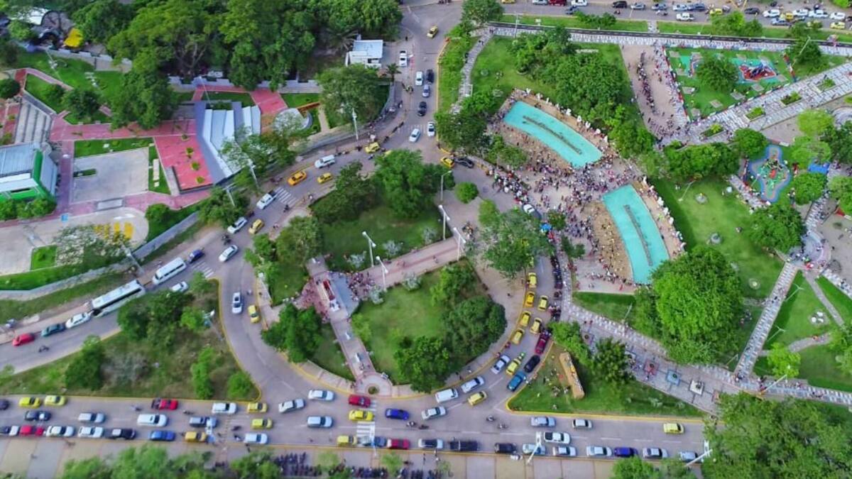 En otra panoránica aérea, muestra los visitantes y los vehículos en los alrededores del Parque. ubicado a orillas del río Guatapurí. En la obra fueron invertidos $8.800 millones y tiene 3,3 hectáreas de extensión. Cuenta con espacios como gimnasios bio-saludables, ciclorrutas, una fuente cibernética y un avión DC-3.