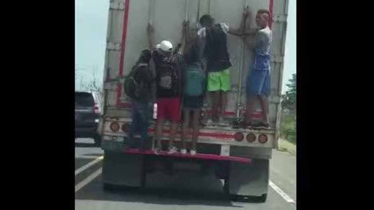 En las imágenes se logra ver a cinco jóvenes colgados -sin ninguna seguridad- de la parte trasera de un camión mientras aprovechan el ‘chance’. El caso ocurrió la mañana de este domingo en la vía que conduce de Barranquilla a Santa Marta. La denuncia fue realizada por un lector de EL HERALDO.