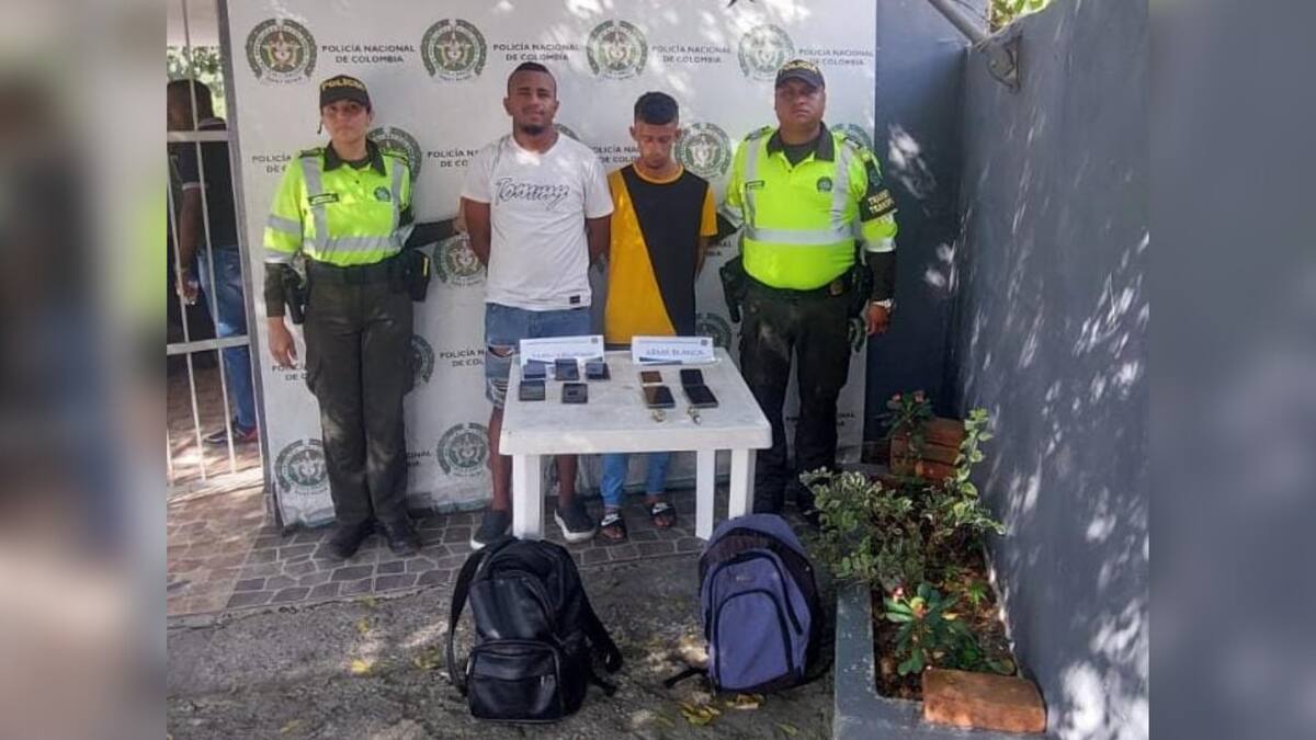Los hombres de 22 y 26 años se montaron en el vehículo simulando ser pasajeros, pero en medio del recorrido la Policía detuvo el bus para hacer una requisa tras haber recibido una información sobre un robo y en efecto a estos dos les hallaron 7 celulares, 2 relojes y un arma blanca (cuchillo).