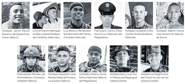 Para el caso de Córdoba, en el municipio de San Bernardo del Viento lloran al soldado Luis Eduardo Blanco Hernández, que tenía previsto llegar a la vereda Pompeya; del municipio de Montelíbano falleció Ederxánder Morales; de Montería murió el soldado Arley Camilo Tordecilla Warnes. De este último su mamá había hecho público a través de redes sociales su desesperación por no saber de él.