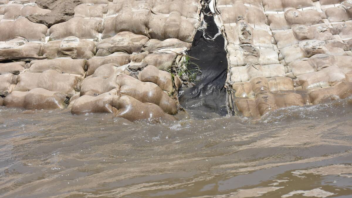 La forma lineal que antes tenía la estructura que cubre el talud ya no permanece en varios tramos de los primeros 300 metros, donde fue instalada. Por efectos de la temporada invernal del año pasado, parte del colchacreto fue cubierto por el río; el mismo que se encargó de mostrar las fallas cuando bajó su nivel.