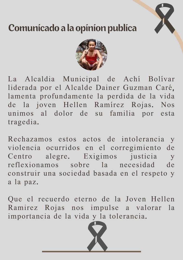 El alcalde de Achí, Dáiner José Guzmán Caré, rechazó lo ocurrido a través de un comunicado que reza: “La Alcaldía Municipal de Achí, Bolívar, lamenta profundamente la perdida de la vida de la joven Hellen Johana Ramírez Rojas. Nos unimos al dolor de su familia por esta tragedia. Rechazamos estos actos de intolerancia y violencia ocurridos en el corregimiento de Centro Alegre. Exigimos justicia y reflexiones sobre la necesidad de construir una sociedad basada en el respeto y la paz. Que el recuerdo eterno de la joven Hellen Ramírez Rojas nos impulse a valorar la importancia de la vida y la tolerancia”.