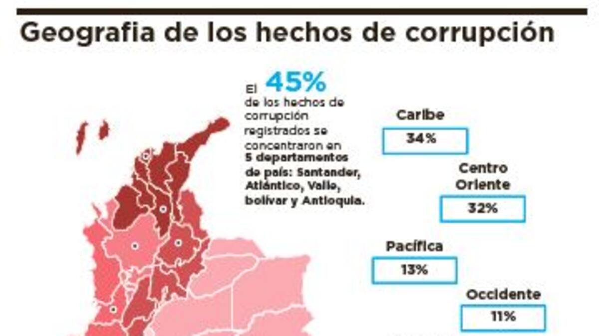 Según Transparencia por Colombia, el 45% de los hechos de corrupción se concentran en 5 departamentos: Santander, Valle, Antioquia, Atlántico y Bolívar. Teniendo la región Caribe el mayor número de casos con el 34%. (Ver gráfico).