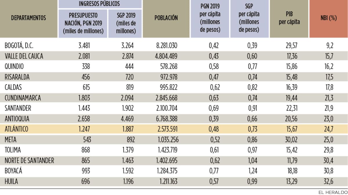 En el cuadro se observa que mientras el Atlántico tiene un NBI de 24,7% se le asigna un presupuesto per cápita de $0,48 millones, mientras que, por ejemplo, Cundinamarca, con un NBI de 21,3%.