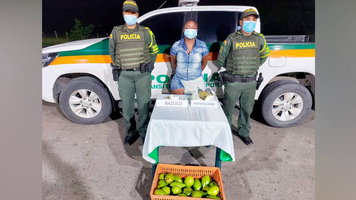 Al realizarle una inspección a una canasta plática en la que llevaba varios aguacates, los uniformados encontraron una bolsa de plástico que contenía 500 gramos de marihuana, y otra bolsa plástico transparente que contenía 310 gramos de bazuco.
