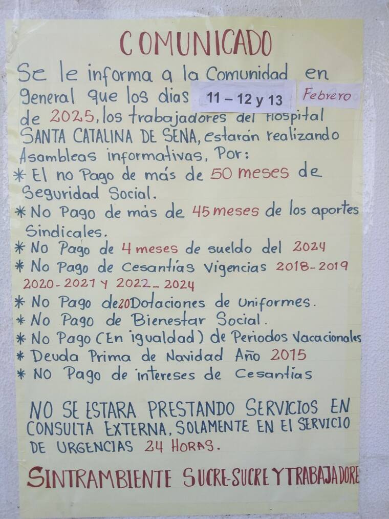 Los empleados le piden al Ministerio de Salud y a la Supersalud prestarle atención a este caso dado que “la gobernadora no tiene solución para esto porque es un ente descentralizado y ella también tiene problemas con otros hospitales. Lanzamos un SOS por la salud en Sucre-Sucre”.