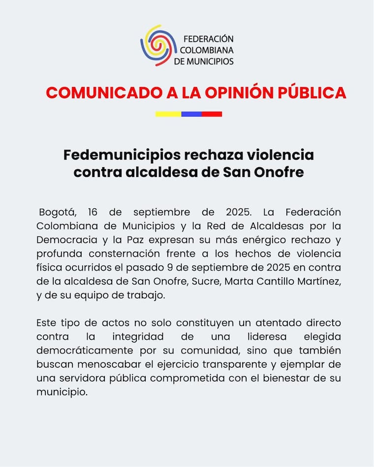 En las últimas horas la Federación Colombiana de Municipios y la Red de Alcaldesas por la Democracia y la Paz se pronunciaron para rechazar “los hechos de violencia física ocurridos el pasado 9 de septiembre de 2025 en contra de la alcaldesa de San Onofre, Sucre, Marta Cantillo Martínez, y de su equipo de trabajo”.