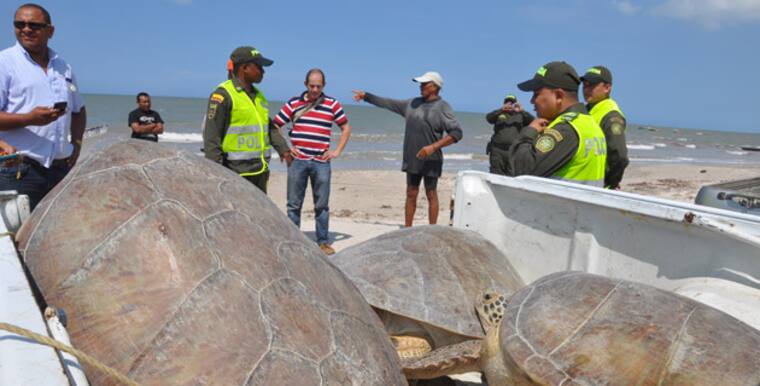 Las autoridades policivas de La Guajira incautaron ayer por el sector de Cuatro Vías en la carretera que conduce hacia el municipio de Uribia, 16 tortugas marinas que eran transportadas por cinco personas en una camioneta marca Ford tipo 150.