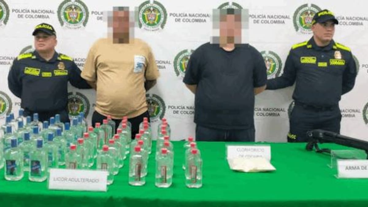 En el procedimiento se incautaron un arma de fuego, clorhidrato de cocaína y varias botellas de licor adulterado, elementos que, según la Policía, vinculan a los detenidos con la comercialización de bebidas que ponen en riesgo la salubridad pública.