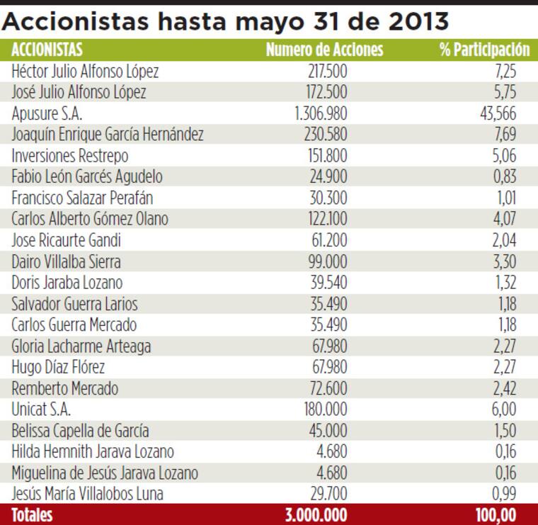 La Asociación de Apuestas Permanentes de Sucre S. A. (Aposucre) cuenta con 21 accionistas entre ellos Héctor Julio Alfonso López que tiene 217.500 acciones que equivalen a un porcentaje de participación del 7.25; José Julio Alfonso López, 172.500 acciones que representan el 5.75%; y Unicat S.A. 180.000 unidades de acciones que representan el 6.00%.