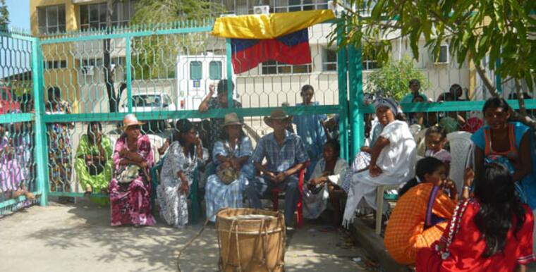 Indígenas wayuu de varias comunidades del área rural de Manaure en La Guajira, protestaron bloqueando las instalaciones del Palacio de Justicia de Riohacha en contra de la captura de 14 de sus miembros, quienes fueron acusados de pertenecer a una organización delincuencial al servicio de la banda criminal Los Urabeños.