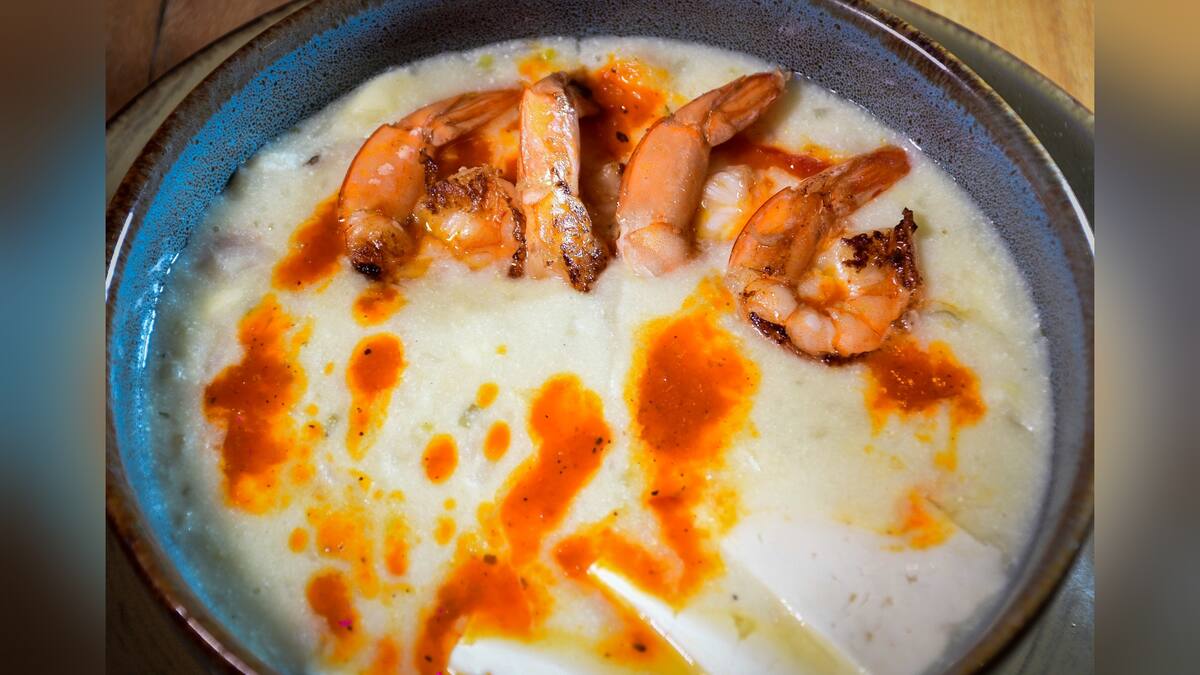 1 kg de ñame espino • 1 litro de agua • 100 g de cebolla roja • 50 g de ajo • 5 g de sal • 250 g de queso fresco duro costeño • 200 g de suero • 4 unidades de langostinos, preferiblemente de talla grande • 1 sofrito de cebolla con 50 g de tomate.