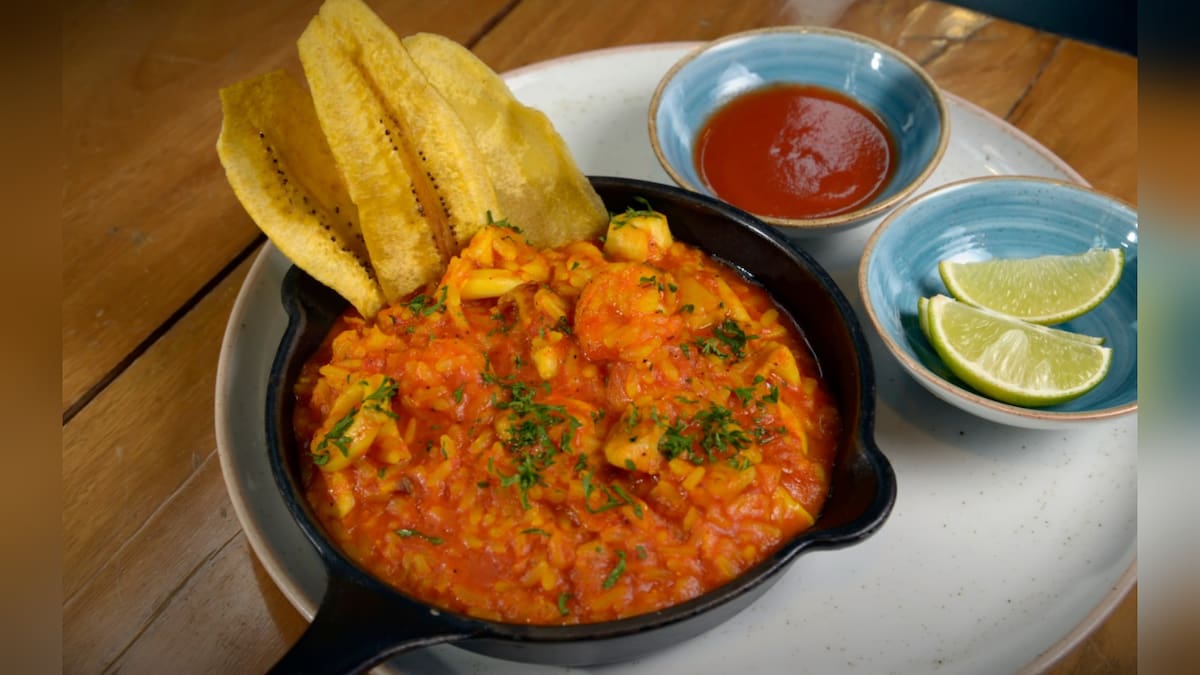 En una sartén o en un wok agrega la mantequilla y sofríe a fuego alto la tilapia en cubos. Luego agrega los mariscos (camarones y anillos de calamar). Deja cocinar hasta que cambien de color y después agrega la cebolla y el puré de ajo. Posteriormente pon el arroz rissotto previamente precocido. Luego agrega la salsa pomodoro y revuelve hasta integrar todos los ingredientes. Después agrega poco a poco el fondo de pescado hasta que la preparación se vaya tornando cremosa. Pon una pizca de sal, pimienta y sazonador de paella, y vuelve a revolver hasta que el líquido seque en un 30%. Al final agrega una cucharada de mantequilla. Si la mezcla tiende a secarse pon un poco más de caldo. Finalmente emplata y encima agrega perejil. Acompaña con unos chips de plátano verde y limón.