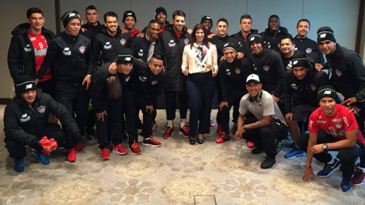 La barranquillera Natalia Abello Vives, embajadora de Colombia en Uruguay, estuvo este martes en la concentración del Junior en Montevideo.