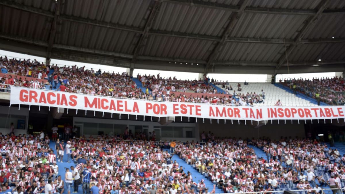 Este domingo, durante el encuentro entre el elenco barranquillero y Atlético Nacional, un grupo de aficionados ubicados en la tribuna oriental alta colgaron una pancarta bajo el lema ‘Gracias Micaela por este amor insoportable’.