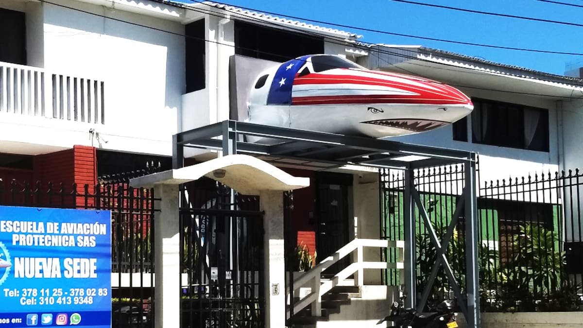 Se trata de un simulador de vuelo de la escuela de aviación Protécnica, ubicada en la carrera 49C #91-90, que no solo llama la atención de los vecinos del sector sino de transeúntes y conductores que se detienen a tomarse una foto con el 'avión oficial' rojiblanco.
