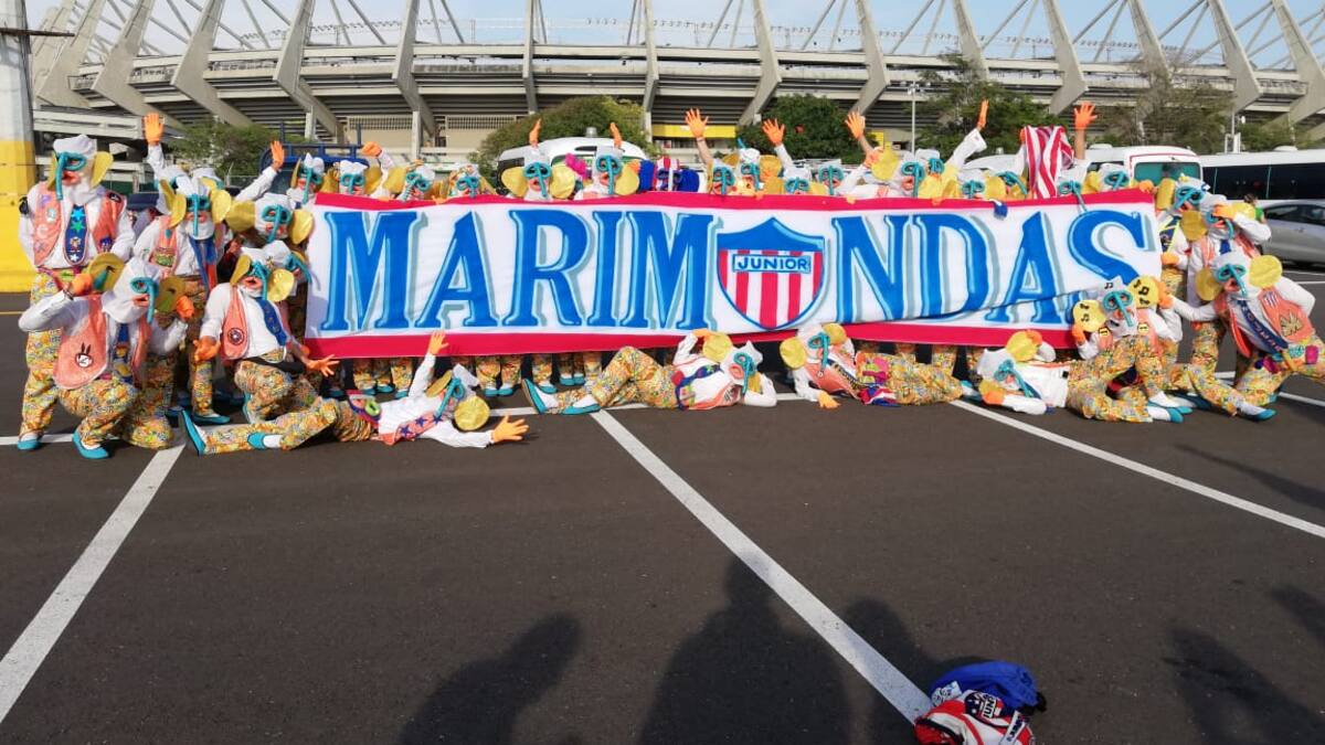 Las Marimondas del Barrio Abajo llegaron horas antes del partido entre Junior y Pasto en el estadio Metropolitano Roberto Meléndez para hacer parte del show previo a la final.