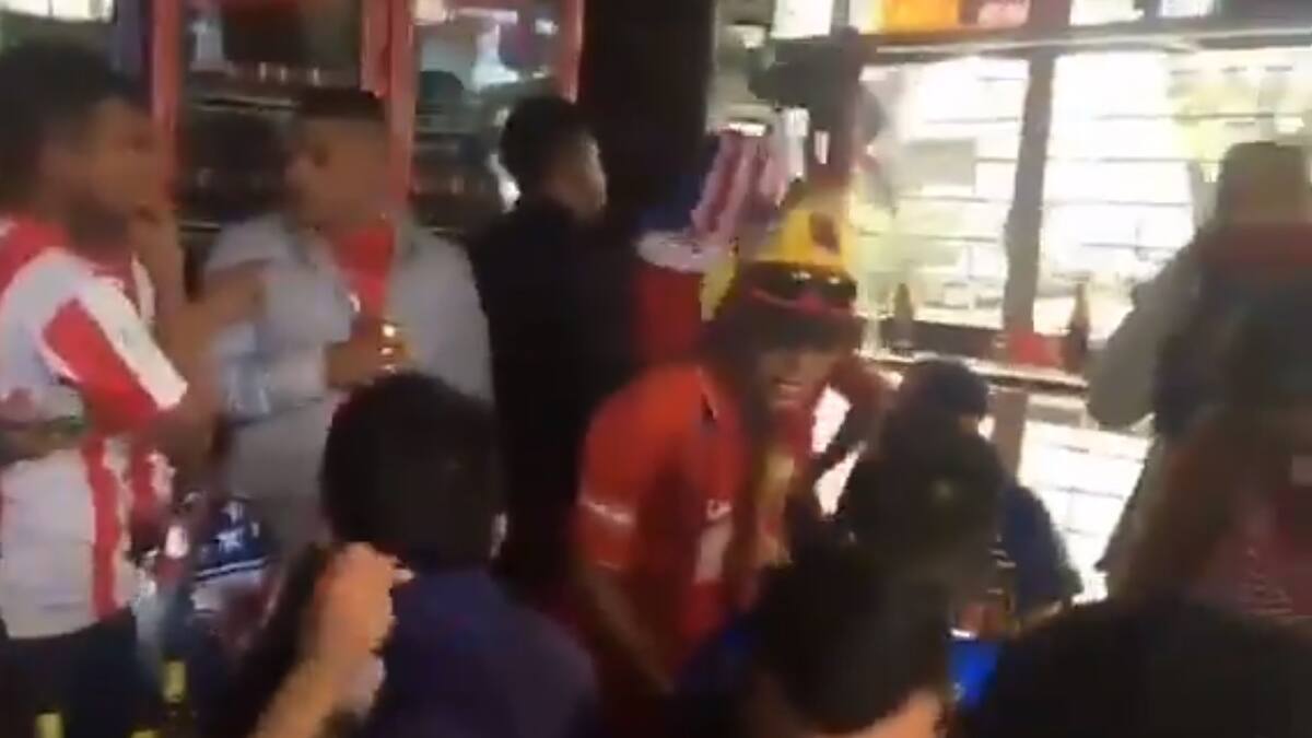 Aficionados de Junior y Pasto comparten este miércoles en una tienda a las afueras del estadio El Campín, horas antes de la final de la Liga Águila.