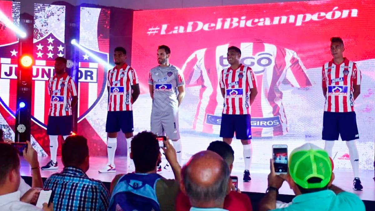Luego del video, Luis ‘Cariaco’ González, Rafael Pérez, Sebastián Viera, Teófilo Gutiérrez y Víctor Danilo Cantillo aparecieron en el escenario con la nueva indumentaria. Al verlos la afición empezó a entonar canticos alusivos al Junior.