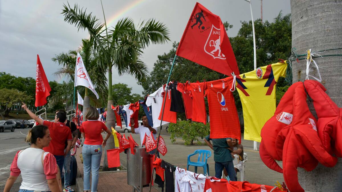'He vendido muchas camisetas, la gente está emocionada y soñando con el título del América, ahí vamos. Mirá, otro cliente', dijo Benítez a EL HERALDO antes de acercarse a una señora motorizada que pregunta por una camiseta blanca de los ‘Diablos Rojos’.