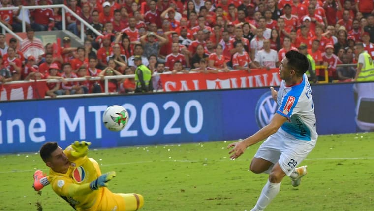 18-Gol de América. Duván Vergara remata al arco, le sale un centro, Michael Rangel la peina y la desvía hacia el arco. La pelota entra de picabarra.