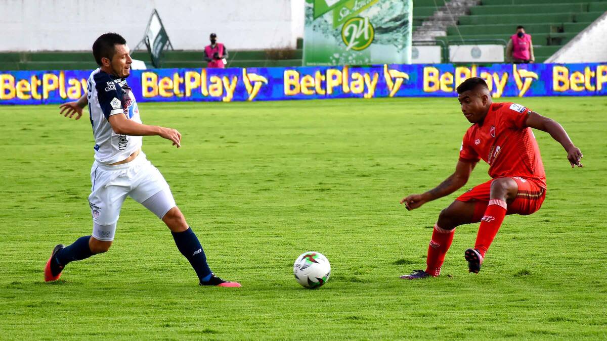 54. Daniel Buitrago le arrebata el balón a Fuentes, elude un par de hombres e intenta bañar a Tunja, pero la bola se va por encima del larguero.