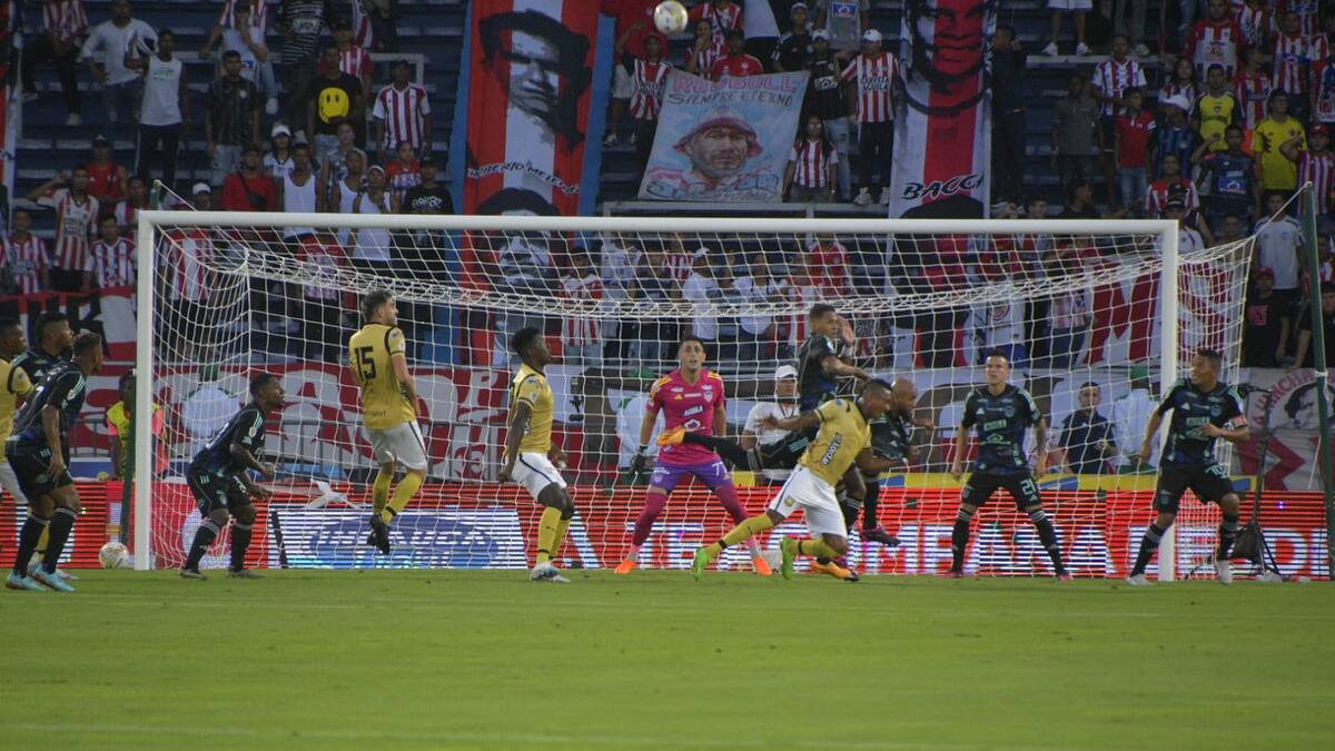 3. Remate de un jugador de las Águilas, que pega en la humanidad del defensor Emanuel Olivera, cuando la pelota tenía destino de gol. ¡Se salva Junior!