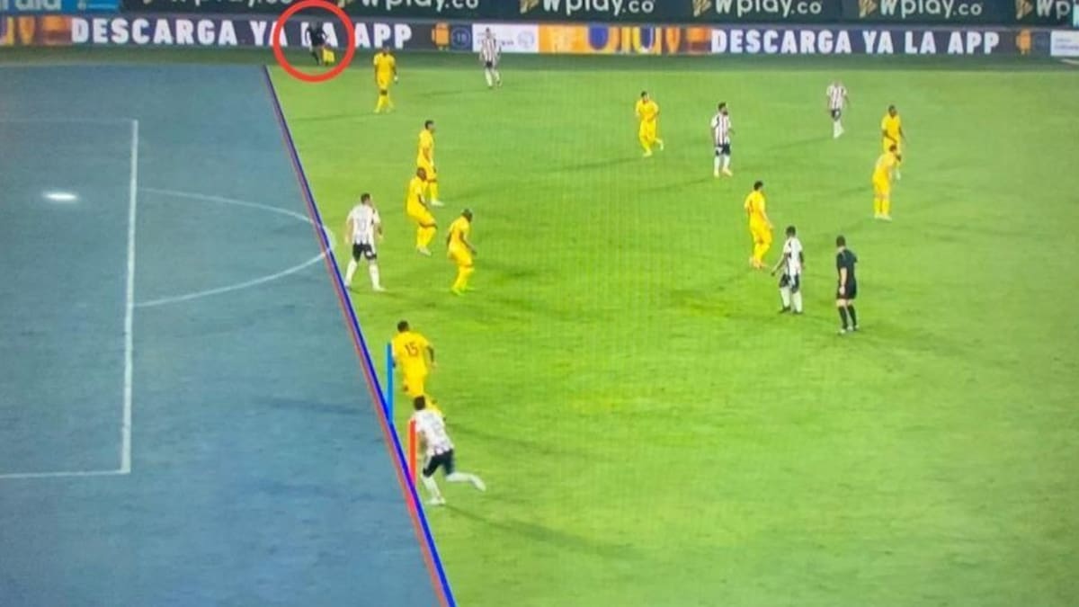 En la imagen que muestra el VAR, es curioso ver cómo la línea diagonal que se traza no tiene como punto de partida al juez de línea, que está en la misma dirección del último defensor del Bucaramanga. Desde esa perspectiva sí se ve un leve adelantamiento de Fuentes, pero es tan mínimo que obliga a los jueces a ser un poco más minuciosos al momento de ubicar el punto de fuga.
