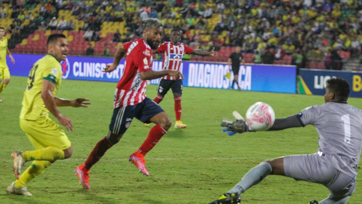 45+3. Dayro Moreno hace una diagonal e impacta un pase profundo de Sherman de media volea. Le pegó muy arriba. Se salvó Junior. El delantero estaba habilitado.