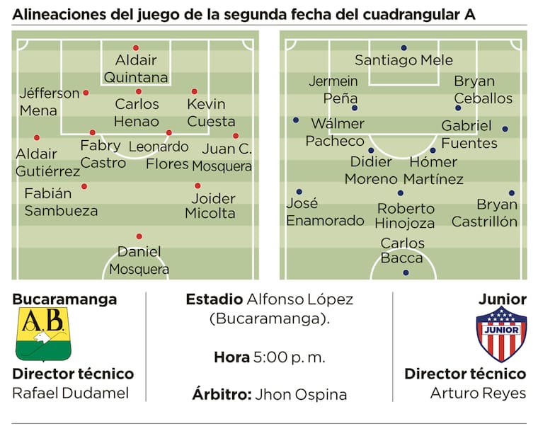 La seguidilla de batallas va dejando bajas. Junior todavía no podrá utilizar a Déiber Caicedo, que sigue lesionado; ni a Emanuel Olivera, expulsado ante los azules. Gabriel Fuentes estaba en duda por una molestia muscular, pero lo más probable es que logre actuar. Víctor Cantillo y Yimmi Chará comenzarían en el banco por el desgaste que acumulan y Hómer Martínez y Roberto Hinojoza entrarían a reemplazarlos.