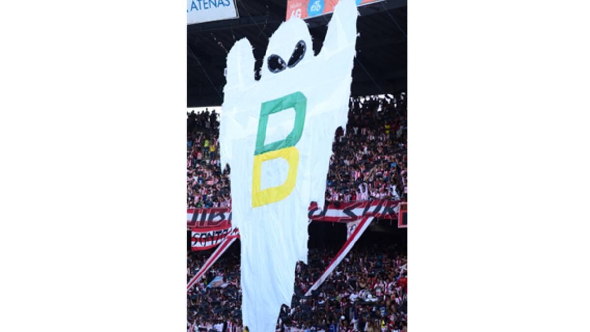La barra Frente Rojiblanco de Sur le recordó el pasado por la segunda división al Bucaramanga. Los hinchas sacaron un trapo con un fantasma que tenía la letra B con los colores que identifican al club santandereano, que permaneció 7 años en la ‘B’.