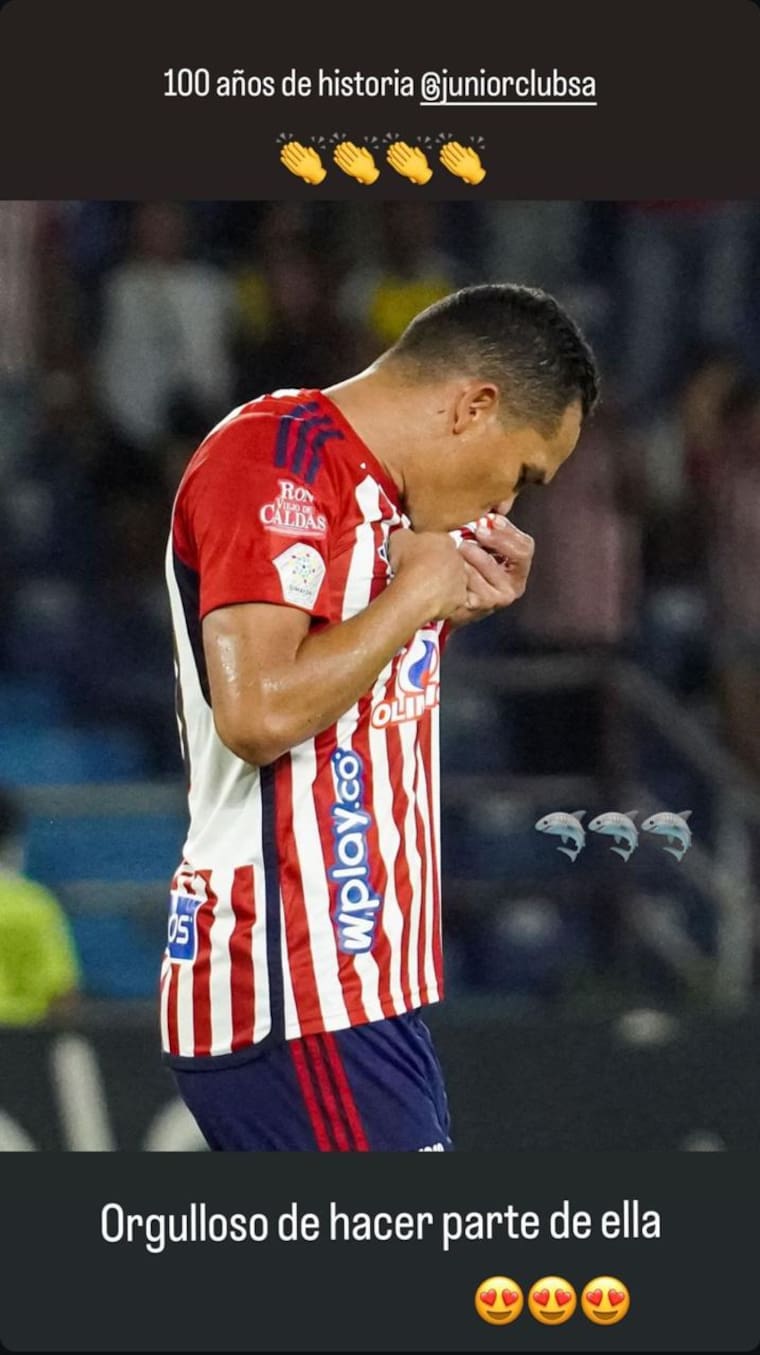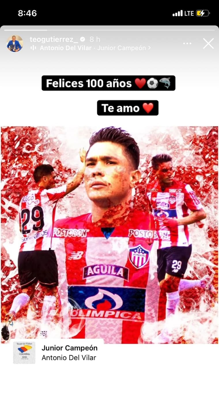 Teófilo Gutiérrez no se quedó atrás con los mensajes de felicitación al club: 'Felices 100, Junior. Te amo', escribió junto a varias imágenes de él portando la rojiblanca.