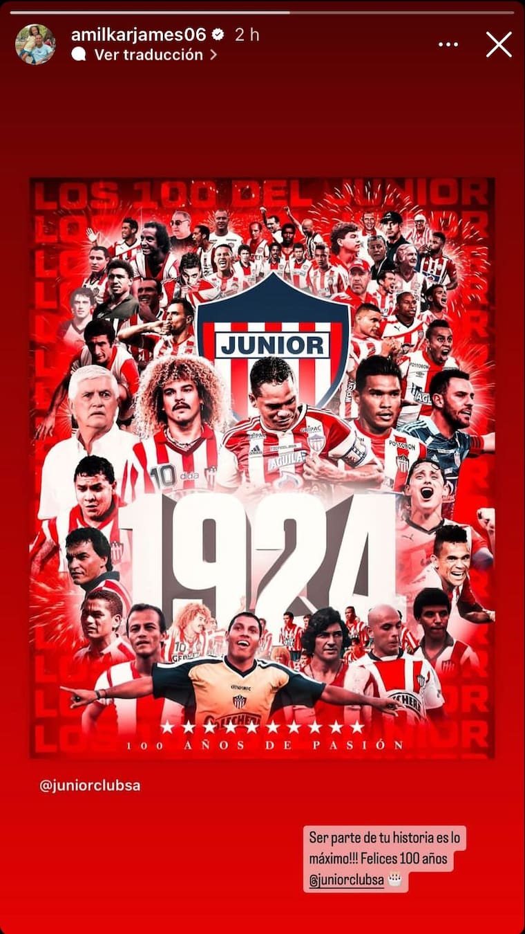 El barranquillero James Sánchez, quien salió del Junior en 2020, expresó: 'Ser parte de tu historia es lo máximo. Felices 100 años, Junior'.