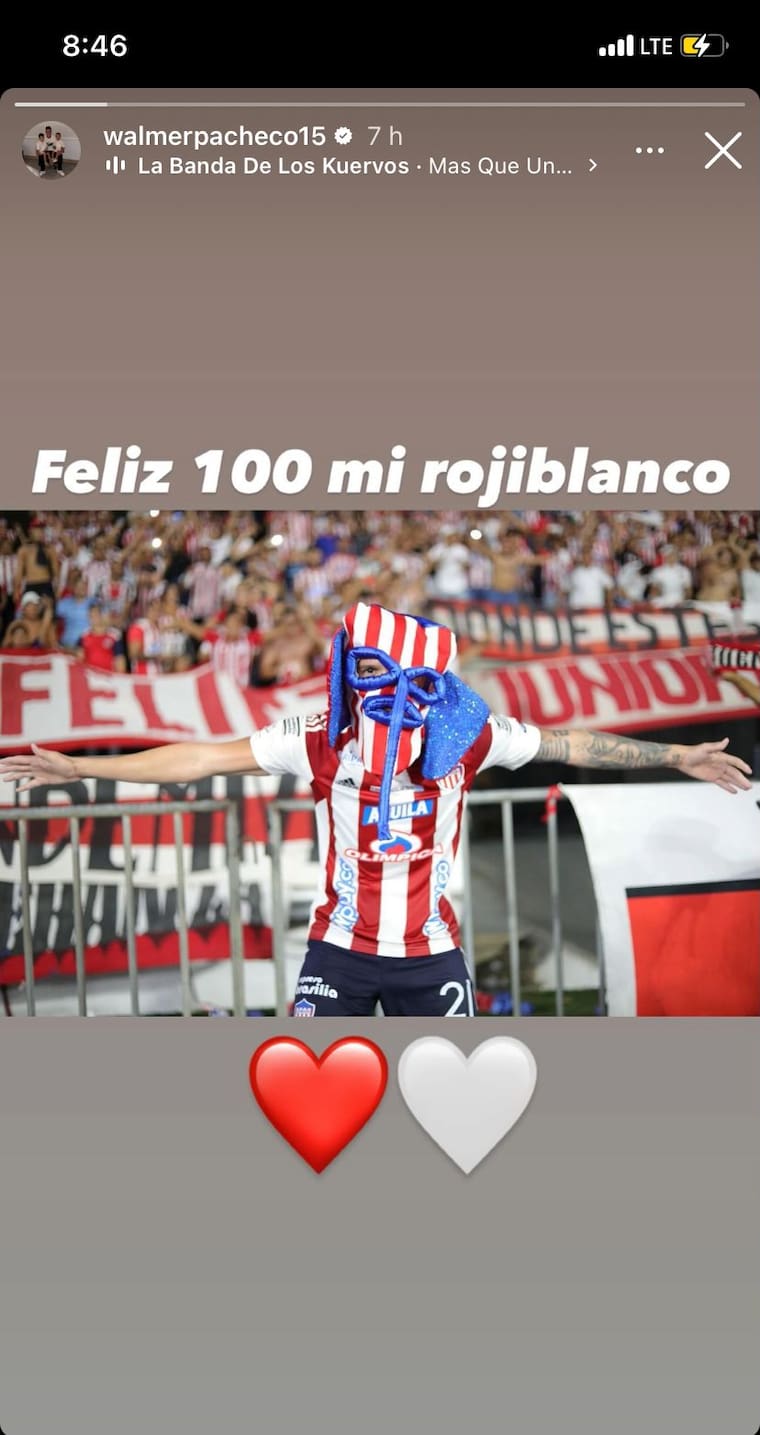 Walmer Pacheco, quien actualmente es jugador del Deportivo Pereira, no ocultó su amor por el Junior, donde estuvo desde 2021 hasta el semestre pasado. En sus redes sociales publicó una foto de él en el Metropolitano utilizando una máscara de marimonda. 'Feliz 100 mi rojiblanco', escribió.