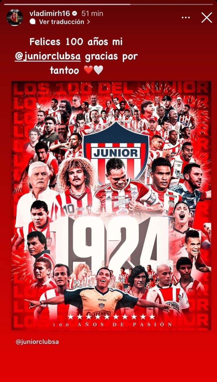 Por su parte, Vladimir Hernández, una de las caras más conocidas del Junior y quien actualmente viste los colores del Santafe, agradeció al club en sus 100 años de existencia. 'Felices 100 años mi Junior, gracias por tanto'.