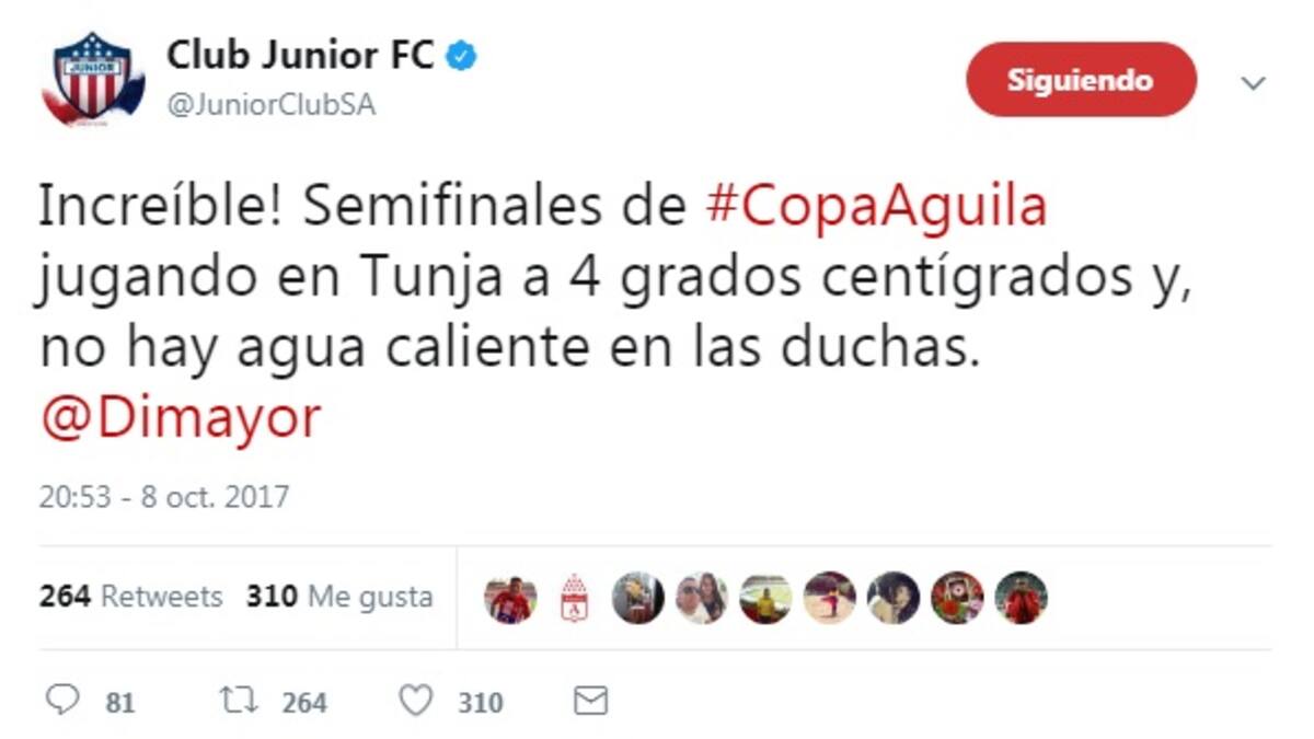 El primer en atacar fue el equipo rojiblanco, publicando un mensaje contundente en Twitter. '¡Increíble! Semifinales de #CopaÁguila, jugando en Tunja a 4 grados centígrados y no hay agua caliente en las duchas', fue el mensaje emitido en la cuenta del cuadro barranquillero a las 8:53 de la noche.