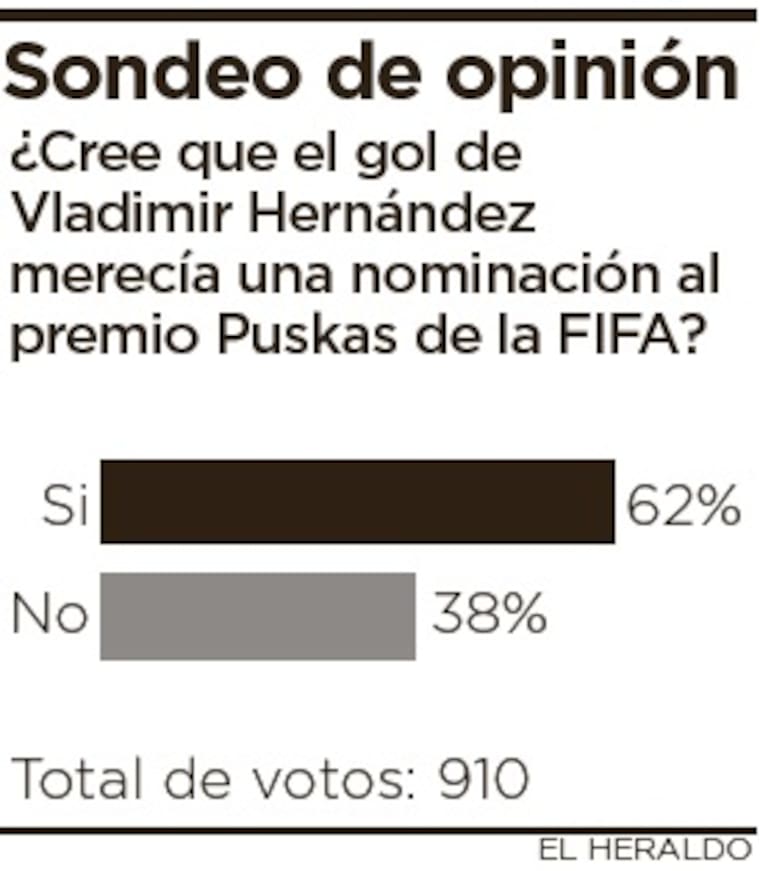 El golazo de chilena de Vladimir Hernández, reconocido el jueves como el mejor del año en Colombia en los premios Liga Águila, parecía tener la suficiente espectacularidad y estética para ser nominado al Premio Puskas de la Fifa, según el concepto de varios periodistas del país y a juzgar por un sondeo de opinión hecho por EL HERALDO en la red social Twitter.