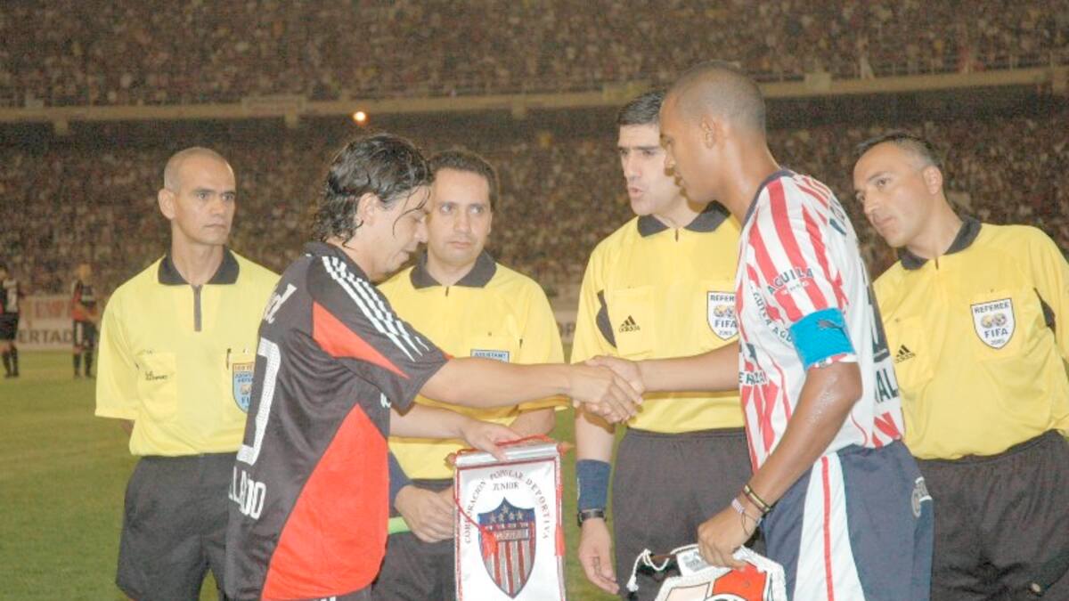 Esa foto exacta no se publicó en EL HERALDO (es ‘la foto que nunca sale’), pero sí otra tomada previamente en la que Gallardo, actual entrenador del cuadro millonario, y Peñaloza, hoy en día director técnico del Barranquilla FC, equipo que foguea en la Primera B los jugadores de las divisiones menores de Junior, se saludan, intercambian banderines y se disponen al sorteo del saque y los arcos ante la mirada de los jueces.