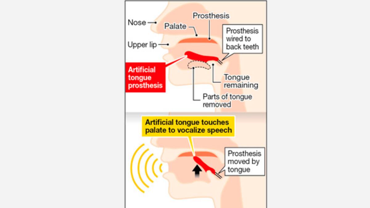 La prótesis de lengua está hecha de resina, de manera que el paciente pueda moverla de arriba a abajo, y se conecta a los dientes anteriores gracias a un alambre, según la fuente.