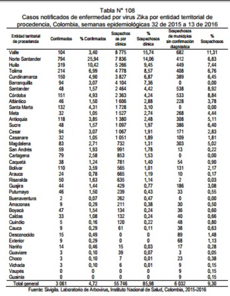 En total son 2.988 casos de zika sospechosos por clínica, de estos 2.046 corresponden a la semana epidemiológica 13 y los demás casos son notificaciones tardías de semanas epidemiológicas anteriores.