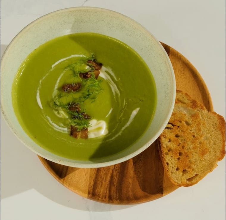 Crema de arvejas con tostada de pan de masa madre