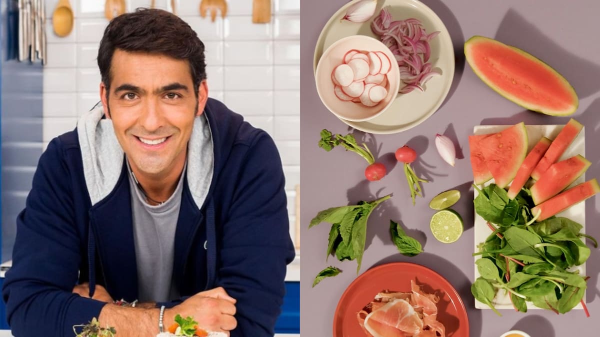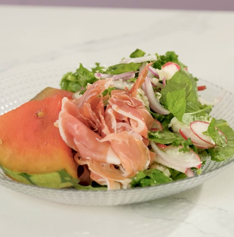Para esta receta se necesitará: 1 patilla pequeña, rábano en mandolina, o finamente picado, aceite balsámico, ½ taza feta crumble, ½ taza de cebolla roja en julianas, albahaca, prosciutto. Para la vinagreta: miel, limón, aceite de oliva, sal y pimienta.