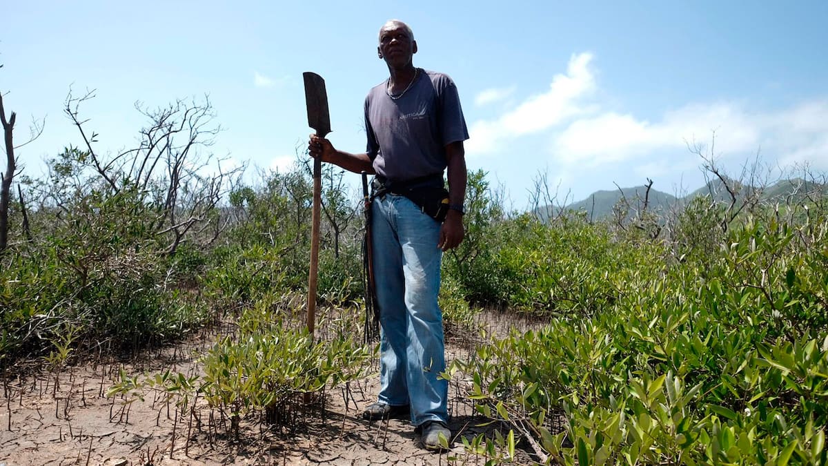 Santiago Taylor vive en Providencia desde que nació; antes del paso del huracán Iota se dedicaba a pescar, pero hoy convirtió su patio en un vivero comunitario de mangle rojo.