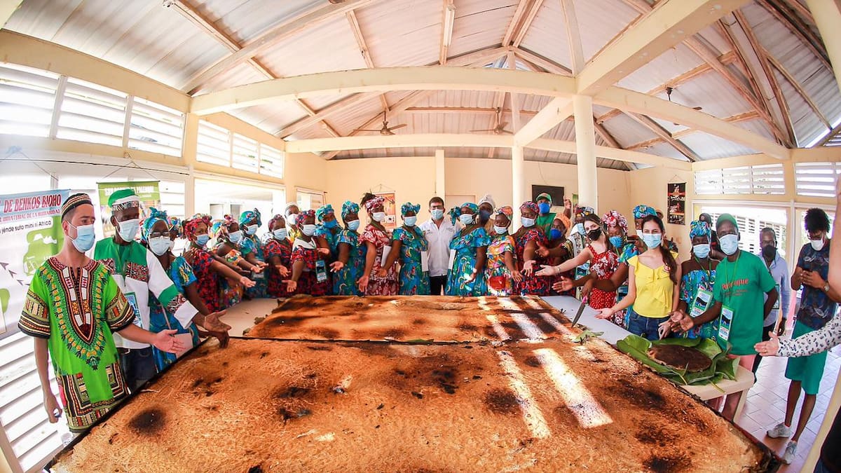 Son 3 metros de largo por 2.5 de ancho las medidas del enyucado más grande del mundo que las manos de las matronas palenqueras acaban de preparar en San Basilio de Palenque. El plato tradicional de este territorio evoca su riqueza gastronómica, que ahora se manifiesta en grandes dimensiones para visibilizar el gusto de sus habitantes por la torta hecha a base de yuca.