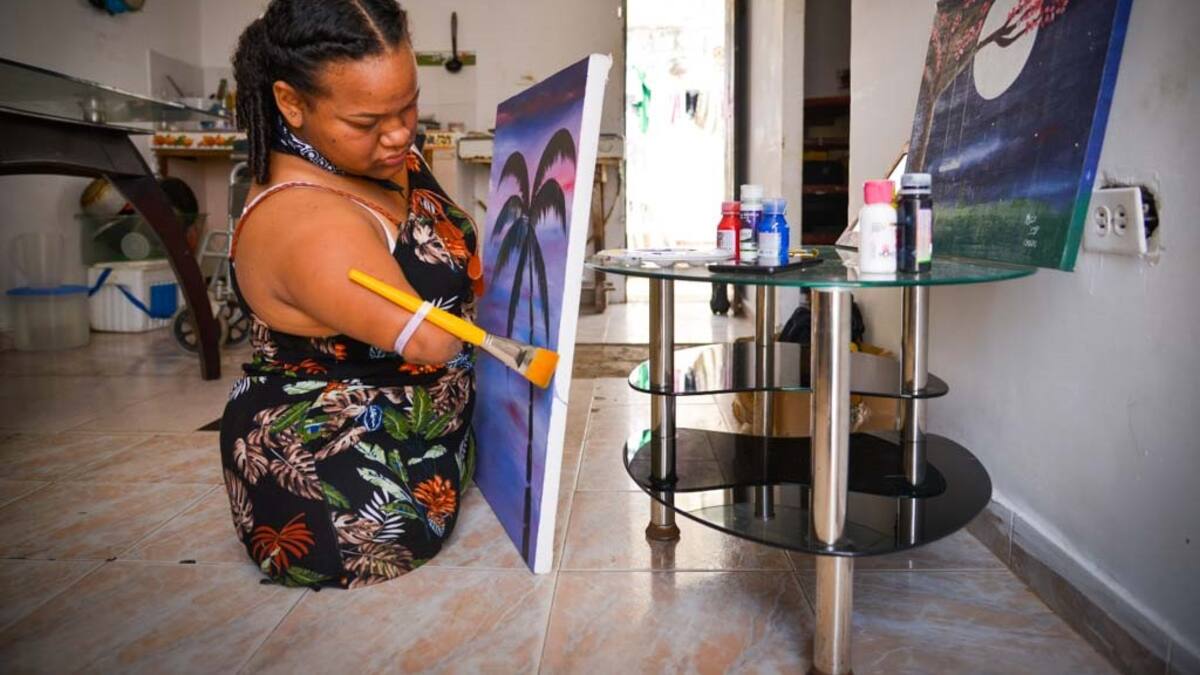 Aprender a escribir fue una de las actividades más complejas, pero lo logró. Inicialmente lo hizo con el pie izquierdo, luego el arte la sedujo y la misma manilla que usaba para sostener el lápiz, es la que hoy utiliza para sujetar el pincel con el que elabora las pinturas. El paisaje y la naturaleza son su mayor inspiración.