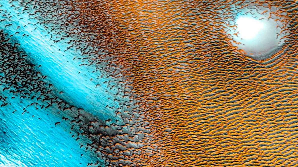 La imagen muestra las dunas de arena que cubren el casquete polar norte del planeta, donde las temperaturas pueden alcanzar hasta -150 ° C (-238 ° F).