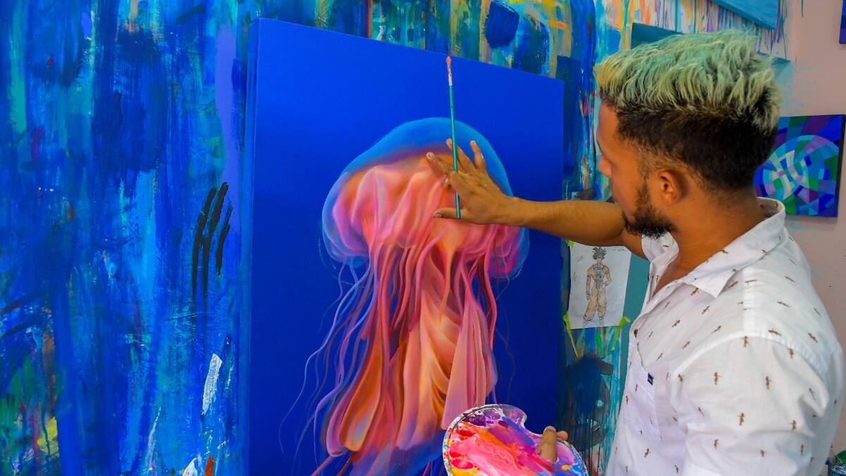 Por ello, las pinturas de Rubén, creadas en acrílico sobre lienzo, parecen reflejar el dolor infinito del mar inundado de basura, pero escondido bajo una explosión de colores y la belleza de sus pinceladas.