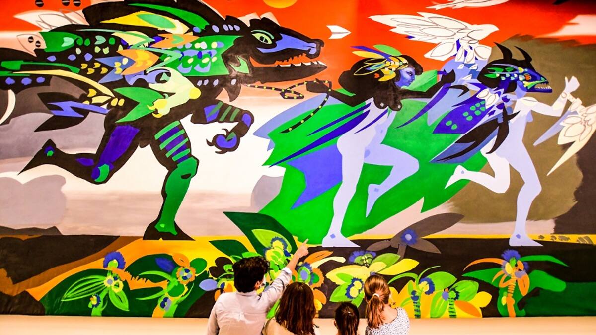 Los colores brillantes y la magnitud del lienzo iluminan y le dan vida al salón con luces tenues del Banco de la República, donde está expuesta la obra que evoca una de las más grandes leyendas de la región Caribe: el Hombre Caimán.