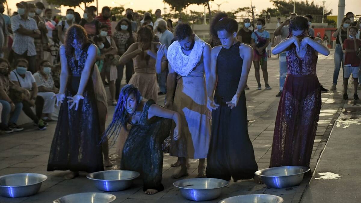 Ocho danzantes reposan en el suelo del Gran Malecón del Río, mientras abrazan unas tradicionales 'poncheras' metálicas de agua. Poco a poco, el sonido de una tuba alemana los va despertando y terminan bañándose completamente con el agua que estaba a su costado.