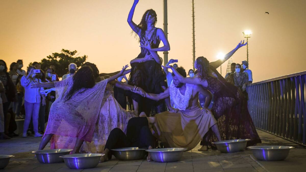 Lo anterior se vio reflejado en la puesta en escena que presentó a ocho danzantes reposando en el suelo del Gran Malecón del Río, mientras abrazaban unas ‘poncheras’ metálicas repletas de agua. El sonido de una tuba alemana de a poco los despertó, para posteriormente terminar dándose un baño con el agua que permanecía en el tradicional recipiente.